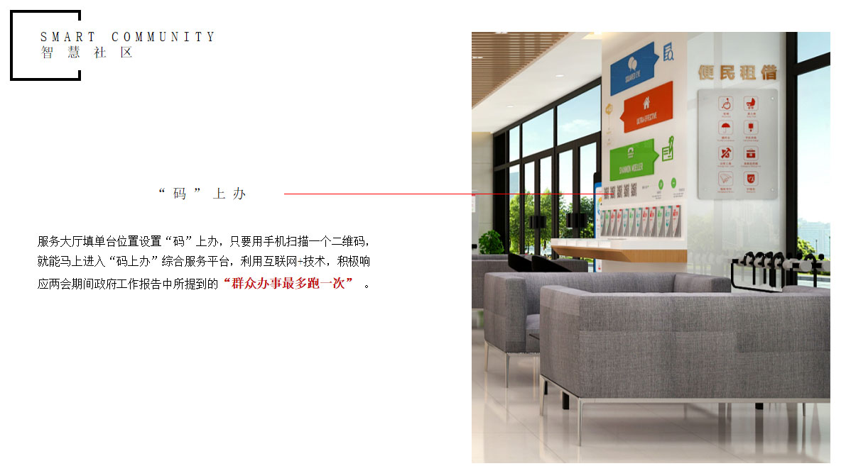 2. “碼”上辦:服務大廳填單臺位置設置“碼”上辦,只要用手機掃描一個二維碼,就能馬上進入“碼上辦”綜合服務平臺,利用互聯網+技術,積極響應兩會期間政府工作報告中所提到的“群眾辦事最多跑一次” 。