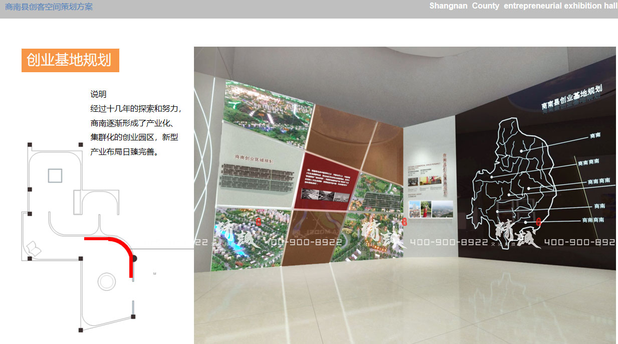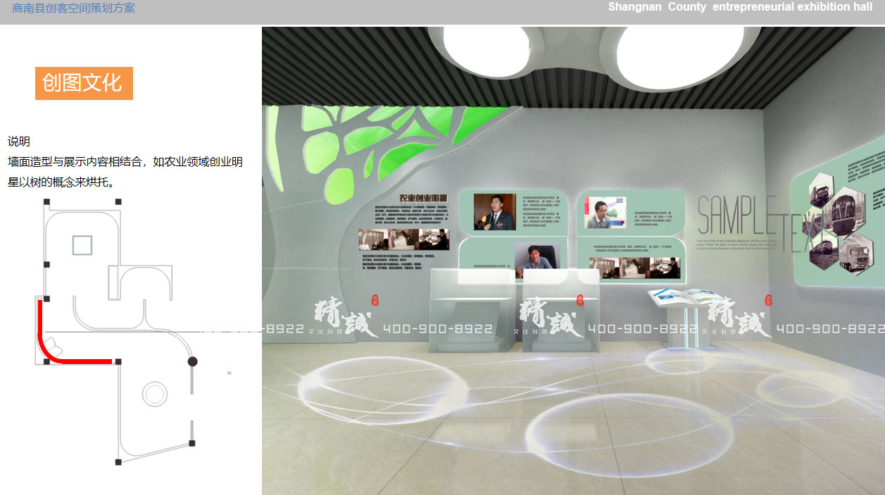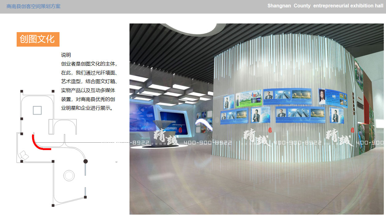 創業者是創圖文化的主體,在此,我們通過光纖墻面、藝術造型,結合圖文燈箱、實物產品以及互動多媒體裝置,對商南縣優秀的創業明星和企業進行展示。