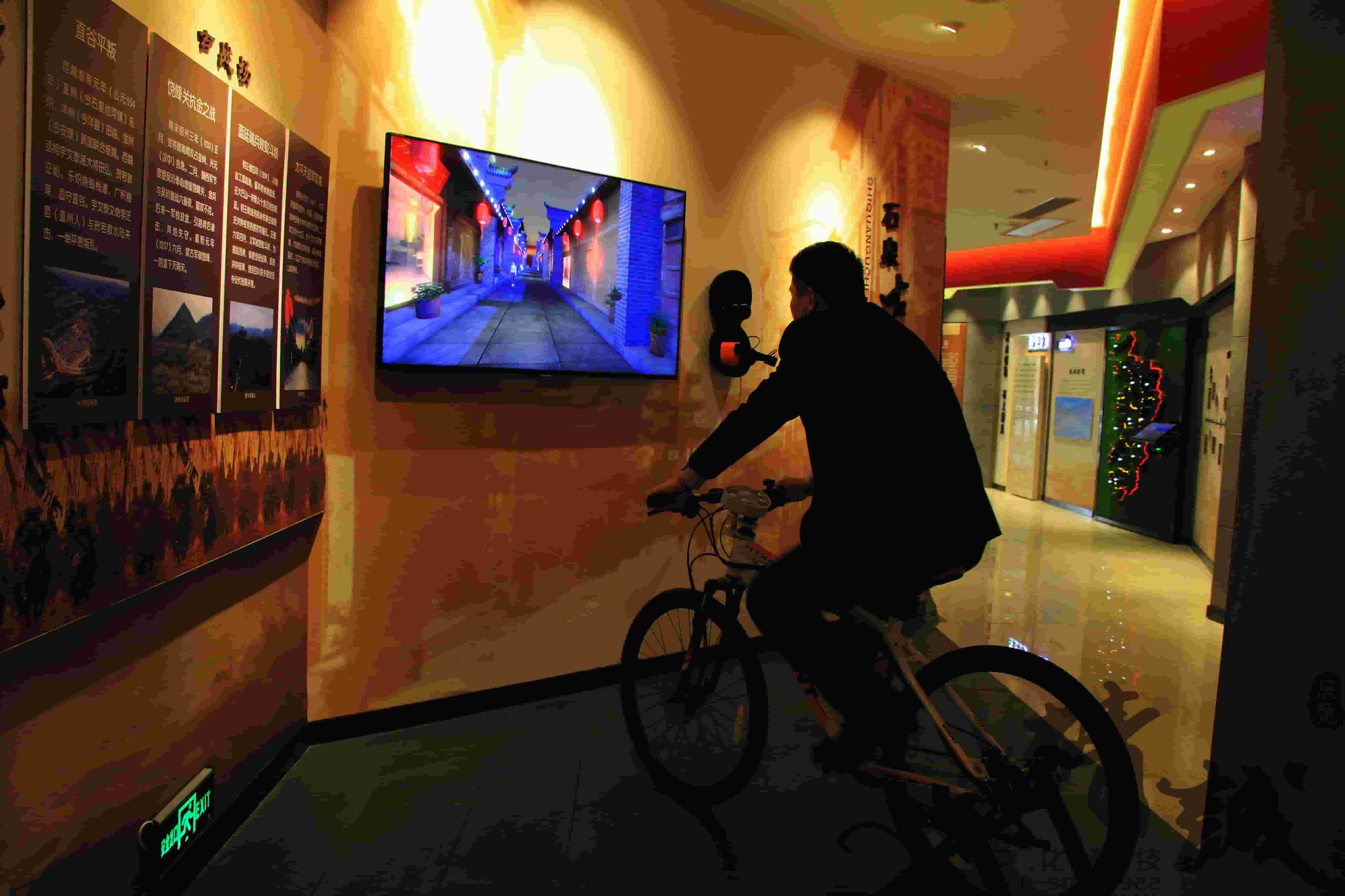 此外該展區采用單車虛擬漫游系統,參觀者戴上VR眼鏡,通過踩動單車石泉明清古城就可能夠直接展現在觀者面前,全方位沉浸式還原古城夜景,盡情領略千年古城之美。