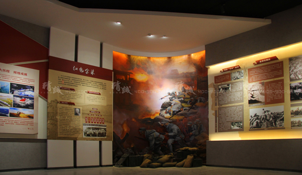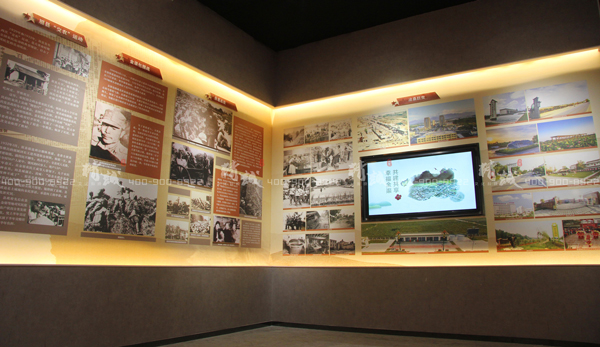 墻面展板通過圖文方式展示了金渠古鎮人杰地靈的燦爛文化和歷史榮耀,同時通過半景畫場景搭建引出紅色金渠的革命史、滄桑巨變發展史,搭載電子觸摸屏,通過互動形式了解關于金渠更多紅色歷史。