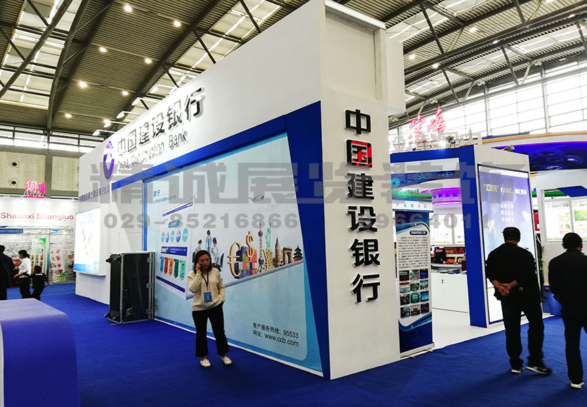“中國建設銀行 建設美好生活”作為展位的主題,從金通科技到悅享生活,以及優智服務的板塊展示,體現中國建設銀行成立以來的成就。運用藍色作為點綴色,代表著嚴格、規范、認真的企業理念;采用logo標志,象征飽滿、親和、通融。